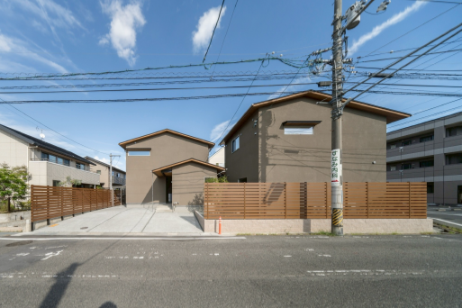 北区西崎の閑静な住宅地の中で静かに並んで建つ2棟の戸建住宅。